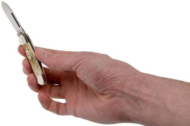 The Case Baby Butterbean is a traditional pocket knife that is also called the Baby Canoe. The model closely resembles the famous Canoe shape. Stylish and incredibly practical. When you look at the side you namely see the resemblance of a canoe. In this case the pocket knife has two similarly shaped blades, they only differ in size. The large blade is namely 4.9 cm long and the small blade 3.6 cm. The protrusions on both sides that make it look like a canoe also have a function. These protrusions ensure that the slightly sharp back of the blade doesn’t get caught behind your pocket. Well thought-out!