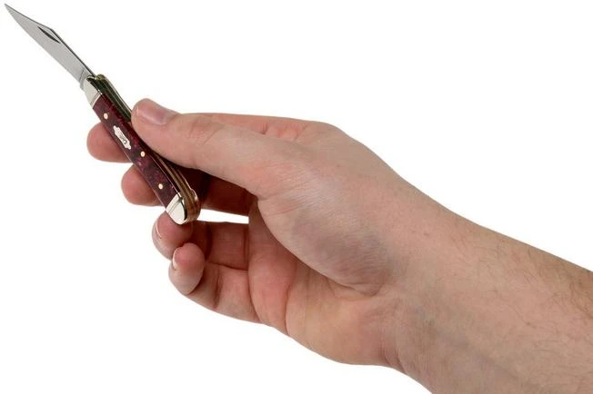 The Case Peanut is a traditional pocket knife with the classic Peanut shape. This pattern takes its name from the shape of the handle: which, with a little imagination, resembles the skin of a peanut. It’s a pretty small knife with two blades in it: a clip-point head blade and a pen-shape secondary blade. Both blades have a slightly different point. You can use them for different tasks, or you can switch blades when one of them is bone. They are both held in place by a slipjoint when opened.